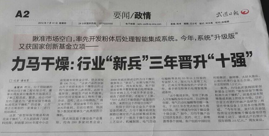 【《武進(jìn)日?qǐng)?bào)》A2版報(bào)道力馬干燥】